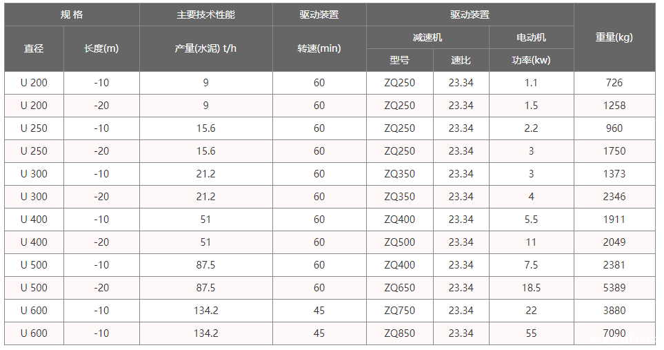 U型螺旋输送机工作时,电机带动旋转的螺旋叶片将物料推移而进行输送,螺旋输送机旋转轴上焊的螺旋叶片,叶片的面型根据输送物料的不同有实体面型、带式面型、叶片面型等型式。使物料不与螺旋输送机叶片一起旋转的力是物料自身重量和螺旋输送机机壳对物料的摩擦阻力。参数如下:
